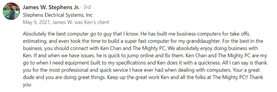 We obsess over meaningful craftsmanship. Our Mighty PCs come from repurposed business-grade components — selected, tested, and rebuilt. The end result? A machine that's reliable, high-performing, and environmentally responsible — designed to serve your unique mission, whatever it may be.